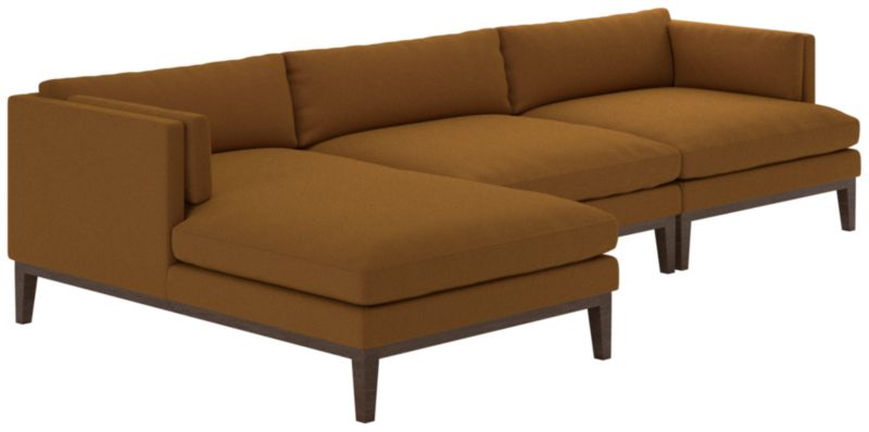Assembled in Mississippi, modern sectional by Melbourne-based design studio VUUE is made for lounging. Slim arms, tapered legs, deep cushions and a bullnose ash wood base all speak to the sectional's casual style. Upholstered in a linen-blend fabric with a performance finish. Customize the sectional layout to suit your individual space. CB2 exclusive.