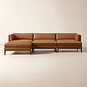 Hand-assembled in Mississippi, modern leather sectional by Melbourne-based design studio VUUE is made for lounging. Slim arms, tapered legs, deep cushions and a bullnose ash wood base all speak to the sectional's casual style. Customize the sectional layout to suit your individual space. CB2 exclusive.