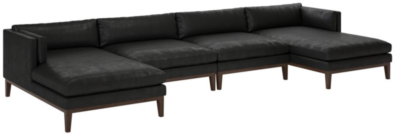 Hand-assembled in Mississippi, modern leather sectional by Melbourne-based design studio VUUE is made for lounging. Slim arms, tapered legs, deep cushions and a bullnose ash wood base all speak to the sectional's casual style. Customize the sectional layout to suit your individual space. CB2 exclusive.