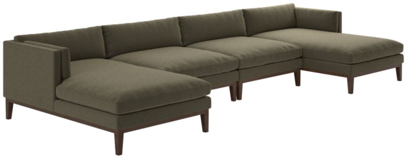 Assembled in Mississippi, modern sectional by Melbourne-based design studio VUUE is made for lounging. Slim arms, tapered legs, deep cushions and a bullnose ash wood base all speak to the sectional's casual style. Upholstered in a linen-blend fabric with a performance finish. Customize the sectional layout to suit your individual space. CB2 exclusive.