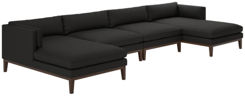 Assembled in Mississippi, modern sectional by Melbourne-based design studio VUUE is made for lounging. Slim arms, tapered legs, deep cushions and a bullnose ash wood base all speak to the sectional's casual style. Upholstered in a linen-blend fabric with a performance finish. Customize the sectional layout to suit your individual space. CB2 exclusive.