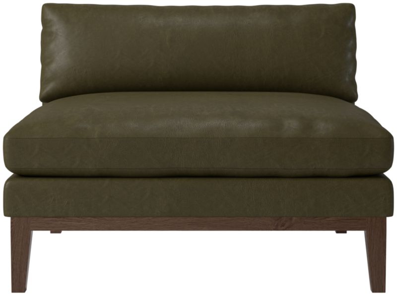 Hand-assembled in Mississippi, modern leather armless chair by Melbourne-based design studio VUUE is made for lounging. Tapered legs, deep cushions and a bullnose ash wood base all speak to the chair's casual style. Float the chair on its own or add coordinating Mona sectional pieces to create a spacious sofa. CB2 exclusive.