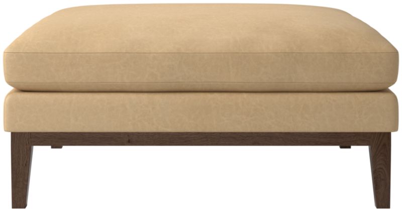 Hand-assembled in Mississippi, modern leather ottoman by Melbourne-based design studio VUUE is made for lounging. Tapered legs, a deep cushion and a bullnose ash wood base all speak to the ottoman's casual style. Float the ottoman on its own or add coordinating Mona sectional pieces to create a spacious sofa. CB2 exclusive.