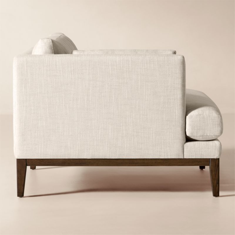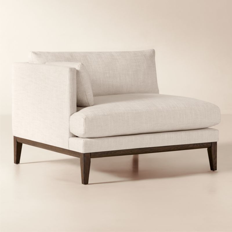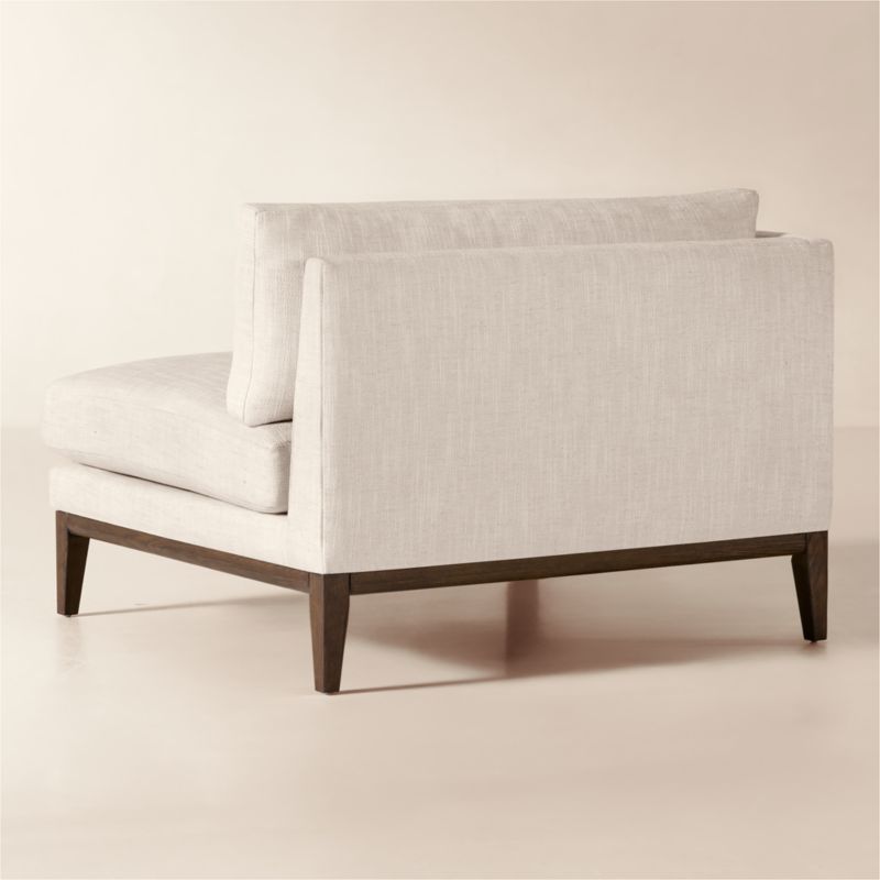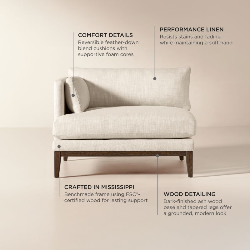 Assembled in Mississippi, modern chair by Melbourne-based design studio VUUE is made for lounging. A slim arm, tapered legs, deep cushions and a bullnose ash wood base all speak to the chair's casual style. Upholstered in a linen-blend fabric with a performance finish. Float the chair on its own or add coordinating Mona sectional pieces to create a spacious sofa. CB2 exclusive.