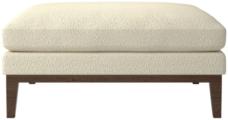 Assembled in Mississippi, modern ottoman by Melbourne-based design studio VUUE is made for lounging. Tapered legs, a deep cushion and a bullnose ash wood base all speak to the ottoman's casual style. Upholstered in a linen-blend fabric with a performance finish. Float the ottoman on its own or add coordinating Mona sectional pieces to create a spacious sofa. CB2 exclusive.