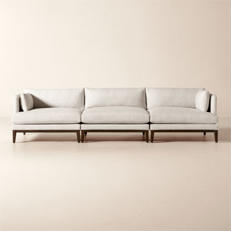 Assembled in Mississippi, modern sectional by Melbourne-based design studio VUUE is made for lounging. Slim arms, tapered legs, deep cushions and a bullnose ash wood base all speak to the sectional's casual style. Upholstered in a linen-blend fabric with a performance finish. Customize the sectional layout to suit your individual space. CB2 exclusive.