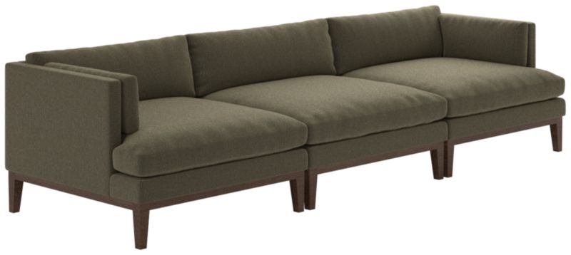 Assembled in Mississippi, modern sectional by Melbourne-based design studio VUUE is made for lounging. Slim arms, tapered legs, deep cushions and a bullnose ash wood base all speak to the sectional's casual style. Upholstered in a linen-blend fabric with a performance finish. Customize the sectional layout to suit your individual space. CB2 exclusive.