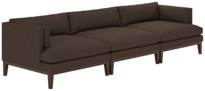 Assembled in Mississippi, modern sectional by Melbourne-based design studio VUUE is made for lounging. Slim arms, tapered legs, deep cushions and a bullnose ash wood base all speak to the sectional's casual style. Upholstered in a linen-blend fabric with a performance finish. Customize the sectional layout to suit your individual space. CB2 exclusive.