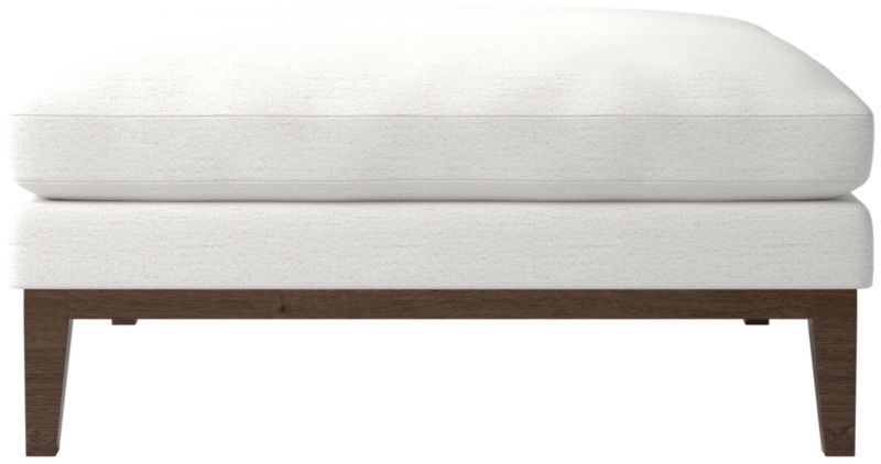 Assembled in Mississippi, modern ottoman by Melbourne-based design studio VUUE is made for lounging. Tapered legs, a deep cushion and a bullnose ash wood base all speak to the ottoman's casual style. Upholstered in a linen-blend fabric with a performance finish. Float the ottoman on its own or add coordinating Mona sectional pieces to create a spacious sofa. CB2 exclusive.
