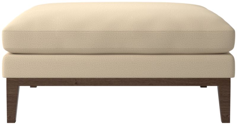 Assembled in Mississippi, modern ottoman by Melbourne-based design studio VUUE is made for lounging. Tapered legs, a deep cushion and a bullnose ash wood base all speak to the ottoman's casual style. Upholstered in a linen-blend fabric with a performance finish. Float the ottoman on its own or add coordinating Mona sectional pieces to create a spacious sofa. CB2 exclusive.