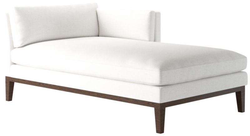 Assembled in Mississippi, modern chaise by Melbourne-based design studio VUUE is made for lounging. A slim arm, tapered legs, deep cushions and a bullnose ash wood base all speak to the chaise's casual style. Upholstered in a linen-blend fabric with a performance finish. Float the chaise on its own or add coordinating Mona sectional pieces to create a spacious sofa. CB2 exclusive.