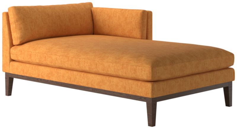 Assembled in Mississippi, modern chaise by Melbourne-based design studio VUUE is made for lounging. A slim arm, tapered legs, deep cushions and a bullnose ash wood base all speak to the chaise's casual style. Upholstered in a linen-blend fabric with a performance finish. Float the chaise on its own or add coordinating Mona sectional pieces to create a spacious sofa. CB2 exclusive.