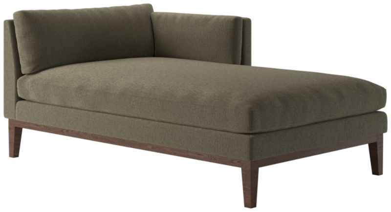 Assembled in Mississippi, modern chaise by Melbourne-based design studio VUUE is made for lounging. A slim arm, tapered legs, deep cushions and a bullnose ash wood base all speak to the chaise's casual style. Upholstered in a linen-blend fabric with a performance finish. Float the chaise on its own or add coordinating Mona sectional pieces to create a spacious sofa. CB2 exclusive.