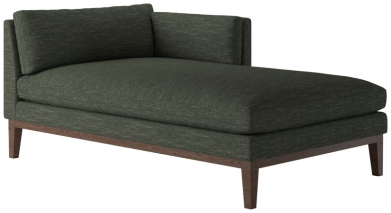 Assembled in Mississippi, modern chaise by Melbourne-based design studio VUUE is made for lounging. A slim arm, tapered legs, deep cushions and a bullnose ash wood base all speak to the chaise's casual style. Upholstered in a linen-blend fabric with a performance finish. Float the chaise on its own or add coordinating Mona sectional pieces to create a spacious sofa. CB2 exclusive.