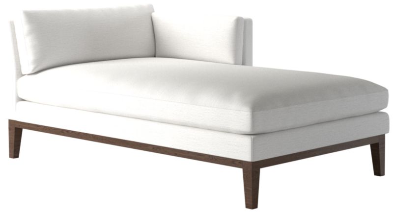 Assembled in Mississippi, modern chaise by Melbourne-based design studio VUUE is made for lounging. A slim arm, tapered legs, deep cushions and a bullnose ash wood base all speak to the chaise's casual style. Upholstered in a linen-blend fabric with a performance finish. Float the chaise on its own or add coordinating Mona sectional pieces to create a spacious sofa. CB2 exclusive.
