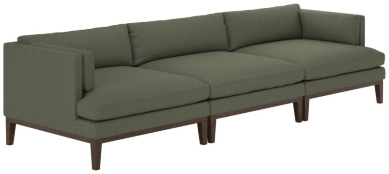 Assembled in Mississippi, modern sectional by Melbourne-based design studio VUUE is made for lounging. Slim arms, tapered legs, deep cushions and a bullnose ash wood base all speak to the sectional's casual style. Upholstered in a linen-blend fabric with a performance finish. Customize the sectional layout to suit your individual space. CB2 exclusive.