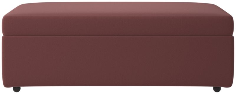 The perfect trailer to our movie sleeper sofa. Extra seat/footrest hinges open to stash blankets and bedding for overnight guests. Upholstered storage ottoman glides smooth room to room on four casters.