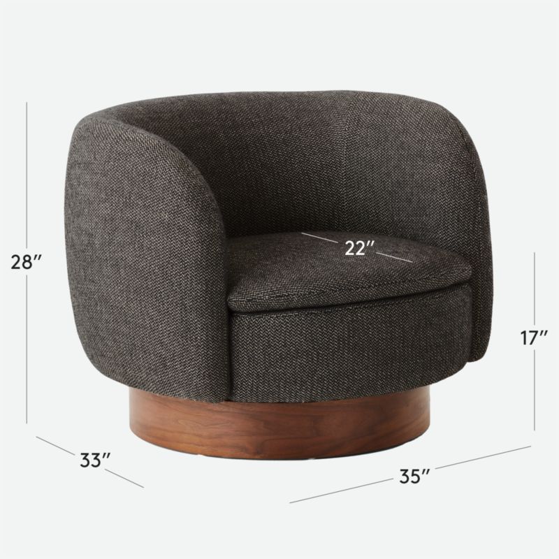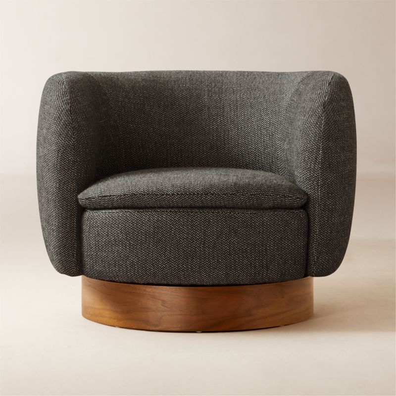 Swivel chair by Los Angeles-based Lawson-Fenning draws on the designers' admiration of California interior design in the 1950s and 1960s. Expertly benchmade, the frame is crafted of wood certified sustainable by the Forest Stewardship Council ® (FSC) with a warm walnut plinth base that swivels 360 degrees. Designed specifically for Muir, the upholstery is woven with wool for elegant texture with accents of white for a midcentury-inspired moment. CB2 exclusive.