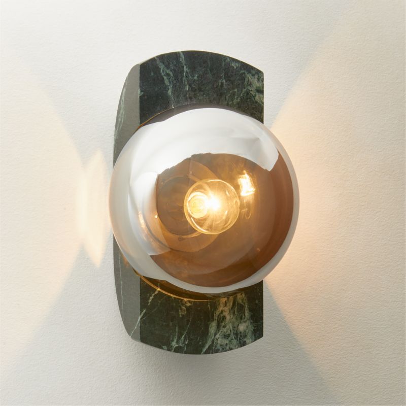 NYC-based designer Farrah Sit's sconce celebrates the balance between the feminine and the masculine. Her design combines crisp edges with the generous curves of carved green marble. A play on scale, oversized smoked glass globe is nestled against the marble, casting a warm glow to dramatic effect. Organic variations in the veining and tonal hues of the marble make each fixture naturally one of a kind. CB2 exclusive.