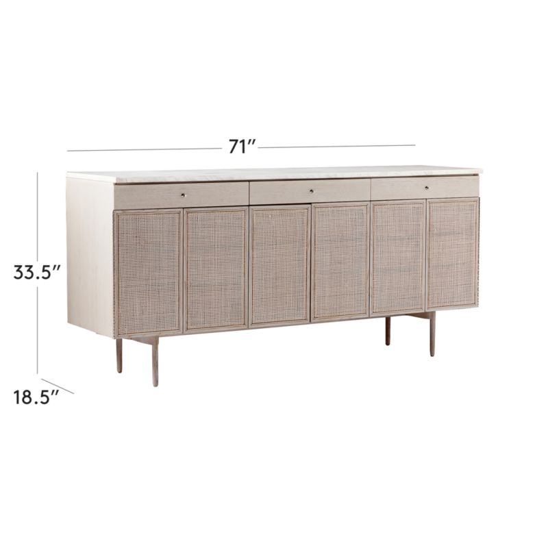 Originally manufactured in dark wood, we updated the New England console with white washed oak veneer, a honed volakas marble top and polished nickel hardware—but otherwise remained true to Paul McCobb's design. Solid oak doors with cane fronts feature piano hinges which open to reveal six additional drawers, providing an abundance of storage for the living room, dining room or bedroom. CB2 exclusive.