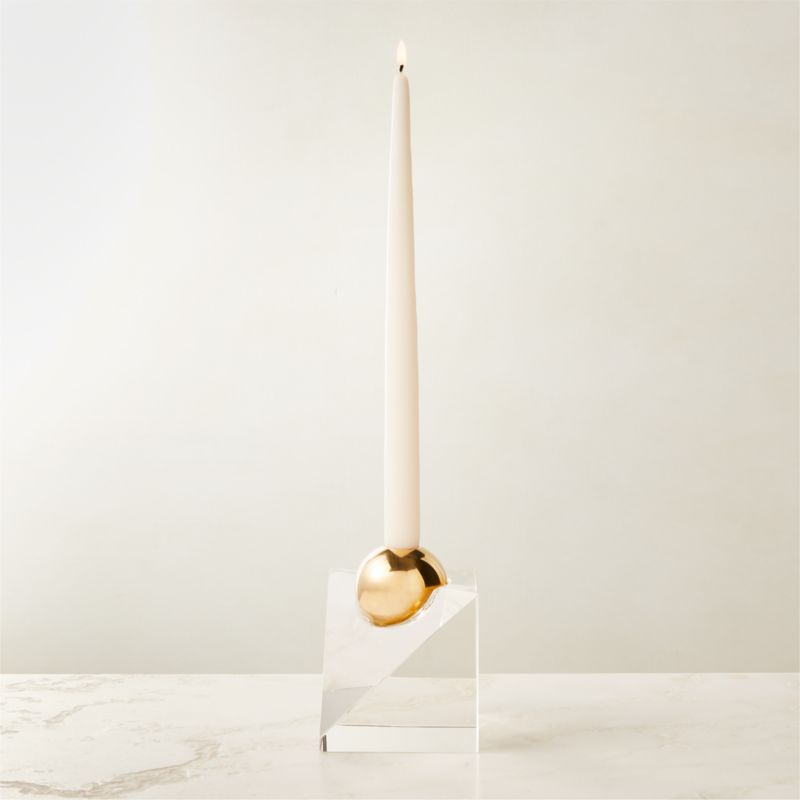 Candle holder by Farrah Sit has an angular, faceted glass base with a trompe l'oeil effect, causing a brass sphere to appear to float above. Sized to hold a taper candle, it adds a touch of postmodern style to any space. CB2 exclusive.