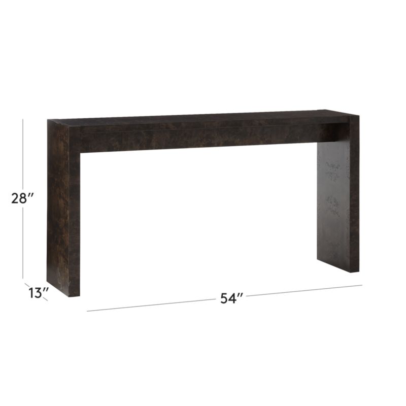 Complemented by clean lines and a minimal design, ebonized burl wood veneer is the star of this console table designed by VUUE. Thick rectangular legs stand flush with the top, providing structural interest without distracting from the wood's gorgeous swirling grain. CB2 exclusive.
