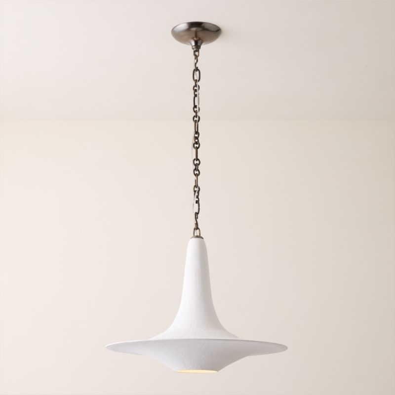 Designed as a modern approach to traditional crystal chandeliers, minimalist pendant by Studio ANANSI combines dark bronze accents with an unexpected white plaster finish applied by hand. The modern plaster shade gives the fixture a sculptural quality, illuminating spaces with a soft glow. CB2 exclusive.