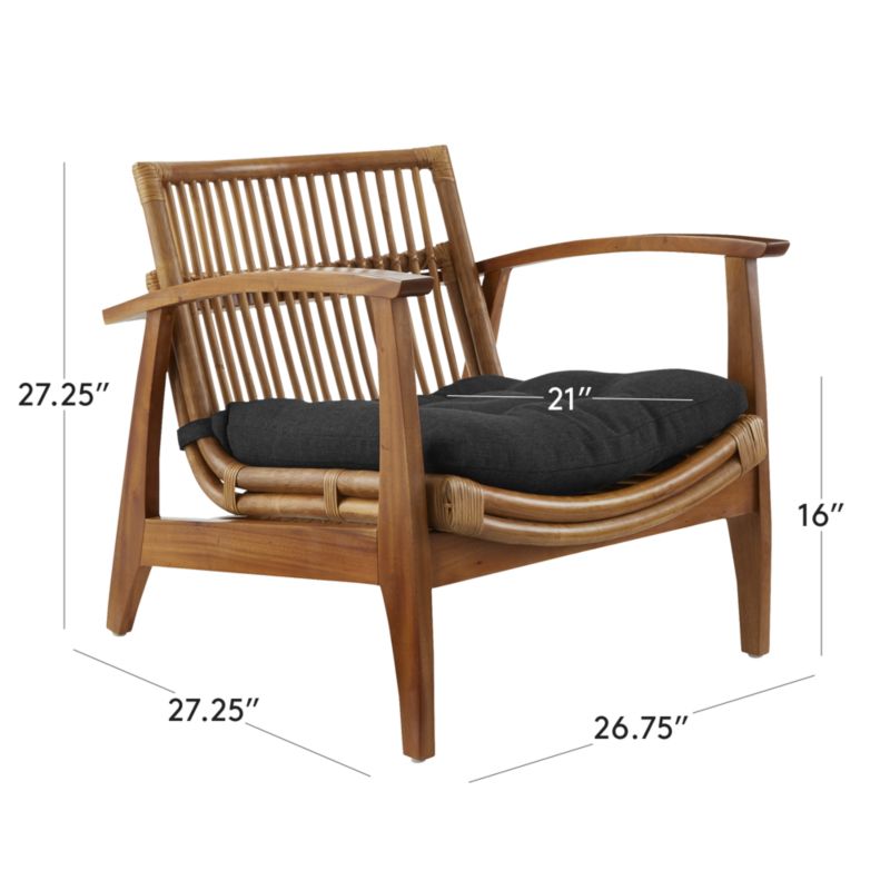 Mindi wood and rattan statement lounge chair brings alfresco vibes indoors. Warm mindi wood frames a strong silhouette while Indonesian rattan curves to shape the back and seat. Extra plush tufted pad in dark grey sits cushy for long-term lounging. Cushion discreetly fastens with velcro straps to keep from sliding. CB2 exclusive.