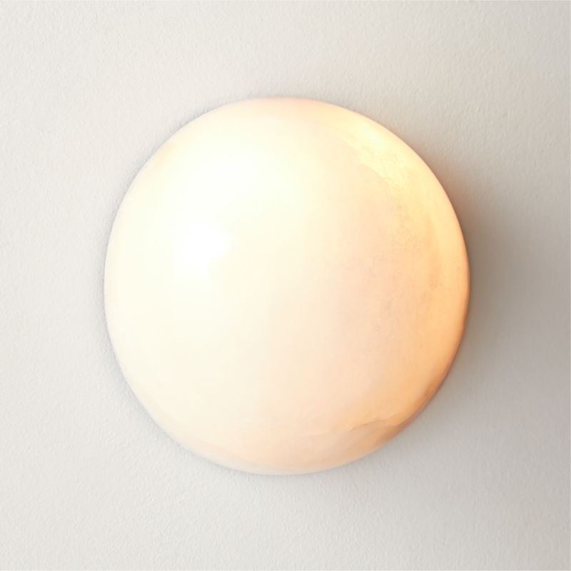 Designed by Melbourne-based VUUE, natural alabaster lends a refined sensibility to both indoor and outdoor settings. Minimalist in form, the round shade is carved by hand of translucent alabaster for stunning effect. Lit from within, the soft glow illuminates the veining and subtle tonal variations unique to each sconce. CB2 exclusive.
