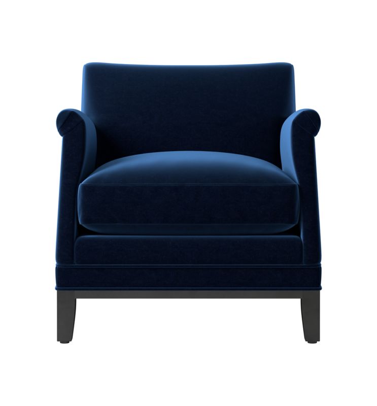 Petite French club chair by Brett Beldock features a tight roll arm and elegant details such as welting and pleats. Upholstered in 100% cotton velvet from a South Carolina mill in operation for more than 180 years, the piece has a luxuriously soft feel. Crafted by hand in North Carolina, its kiln-dried hardwood frame and plush cushion convey a high level of quality. CB2 exclusive.
