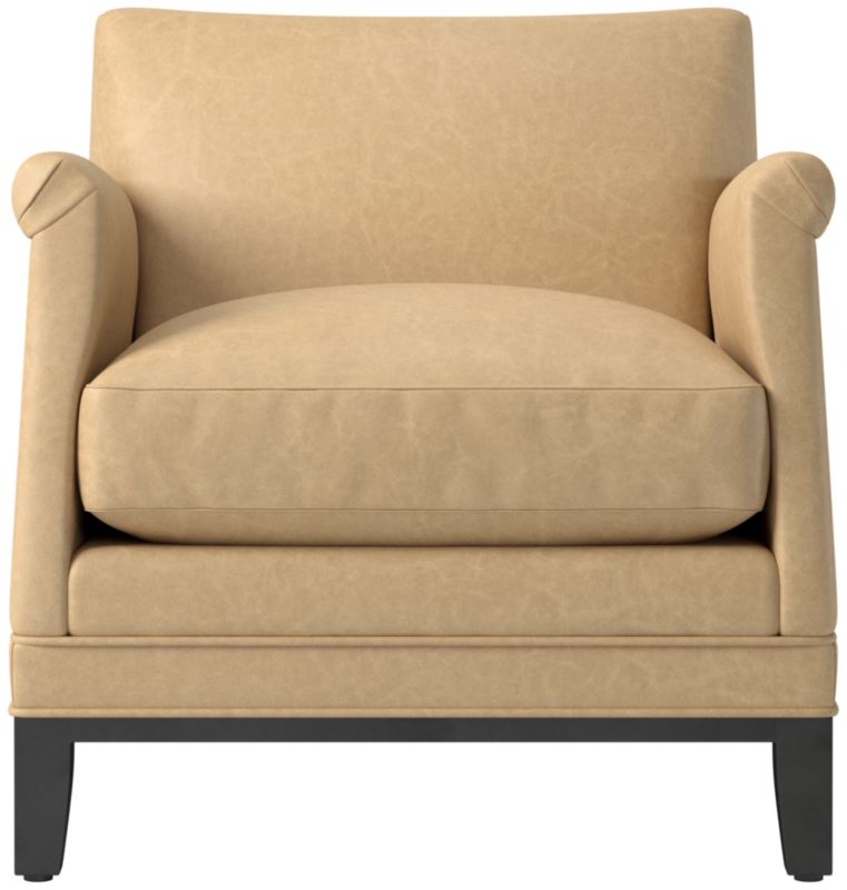Hand-assembled in North Carolina, leather chair by NYC-based designer brett beldock pays homage to vintage french club chairs. flanked by rolled arms, the chair's clean lines are complemented by plush leather upholstery. cb2 exclusive.
