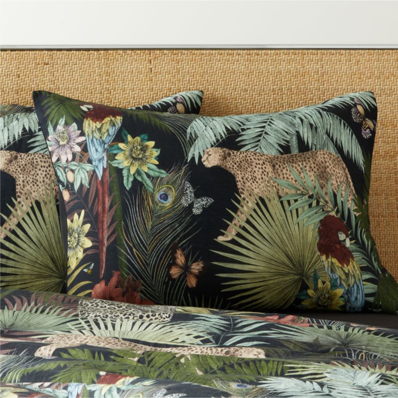 Standard pillow shams by iconic English designer Matthew Williamson features macaws, butterflies and jaguars slinking through palm tree foliage. Rendered in lush, vivid detail, the print brings a touch of the tropics to the bedroom. Linen front is light and airy, while hypoallergenic TENCEL™ lyocell is cooling, breathable and exceptionally soft to sleep beneath. Coordinates with CB2 exclusive.