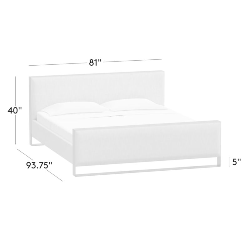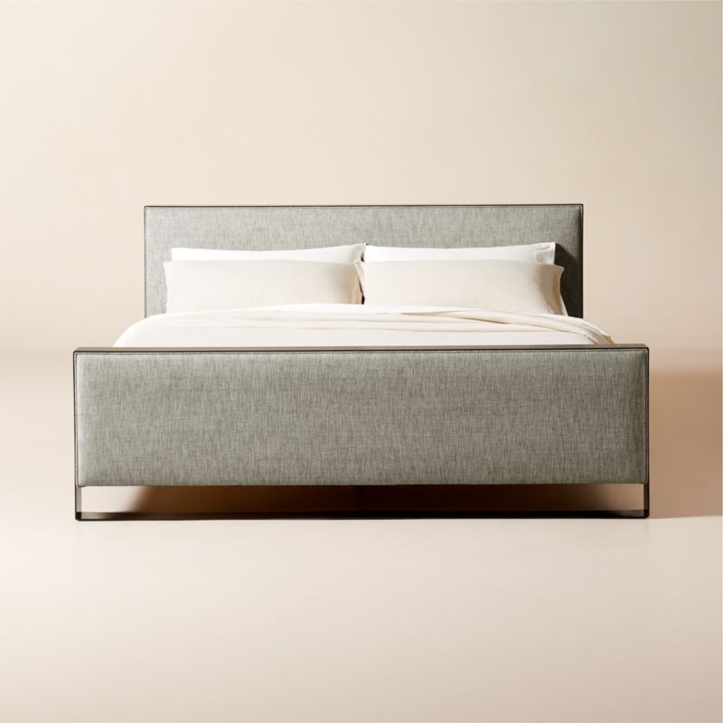 Soft black metal bed from NYC-based designer Mateo Aguirre is defined by clean lines. Crafted with a blackened steel finish for a soft, subtle sheen, the crisp metal bed features understated accents like textured linen-blend upholstery and a welt trim on the headboard and footboard for contrast. CB2 exclusive.