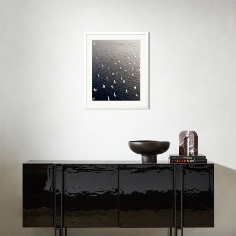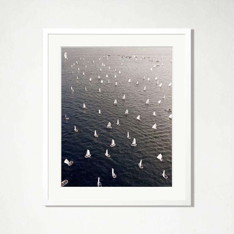 Boats float and drift in the sea near Athens, Greece, as captured by Greek artist Costas Spathis in 2019. Part of our collaboration with Sonic Editions, the image is printed and expertly mounted in a handcrafted wood frame with a white painted finish.