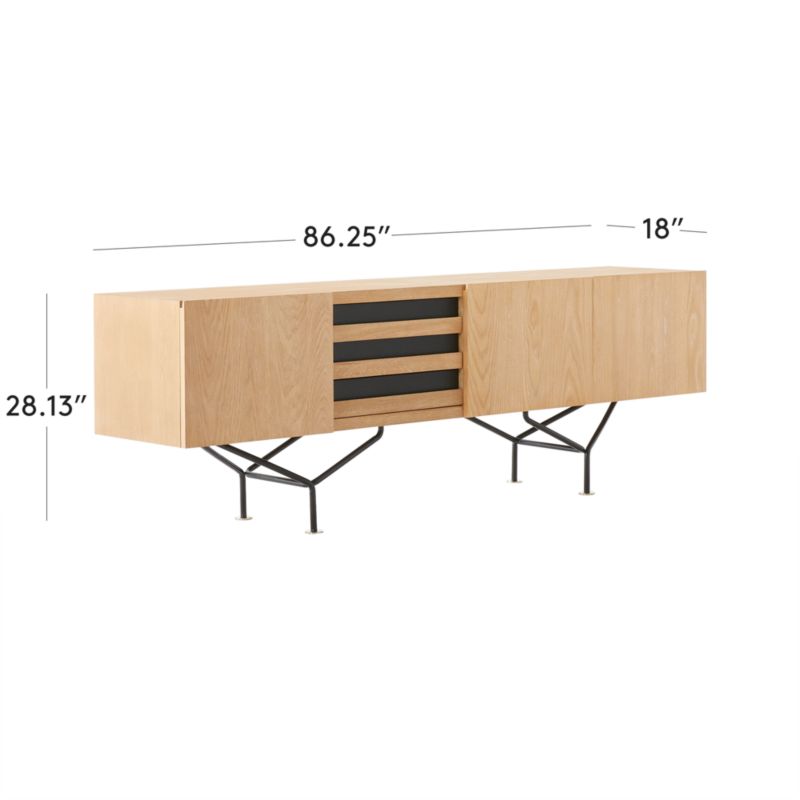 Among the most mysterious pieces in the Gianfranco Frattini collection, this oak credenza was rediscovered through a set of vintage black and white photographs. Designed in 1954, its silhouette embraces the clean lines and decisive angles characteristic of midcentury modernism. Frattini's respect for fine woodworking is honored through a white cerused oak finish, made with wood certified sustainable by the Forest Stewardship Council ®. Three drawers in ebonized black oak pull out on smooth wood drawer glides while three cabinets open to reveal adjustable shelves. Set atop sleek black powdercoated legs, this midcentury credenza handles the details with finesse, down to the champagne brass of its feet. CB2 exclusive.