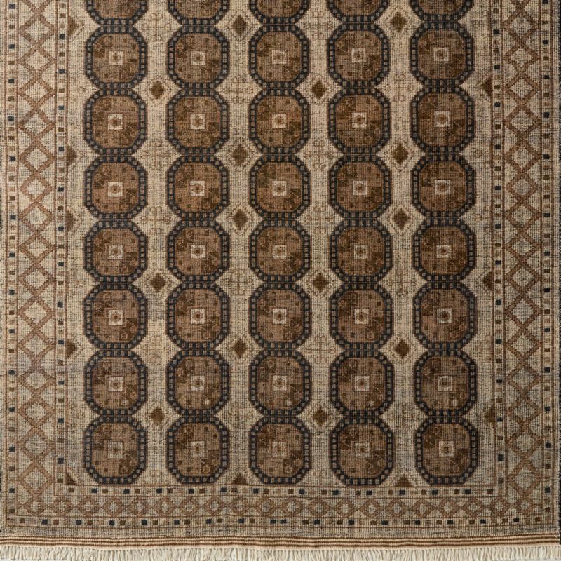 Rooted in the geometric artistry of traditional Turkish and Caucasian rugs, this hand-knotted wool rug brings a storied pattern into a modern context. Rows of intricate octagonal medallions anchor the intricately detailed design, each one connected by a lattice of diamond and cross-shaped forms—a subtle nod to heritage craftsmanship. Rendered in a muted palette of cream, warm brown and black, the rug tempers its bold geometry with understated elegance. CB2 exclusive.