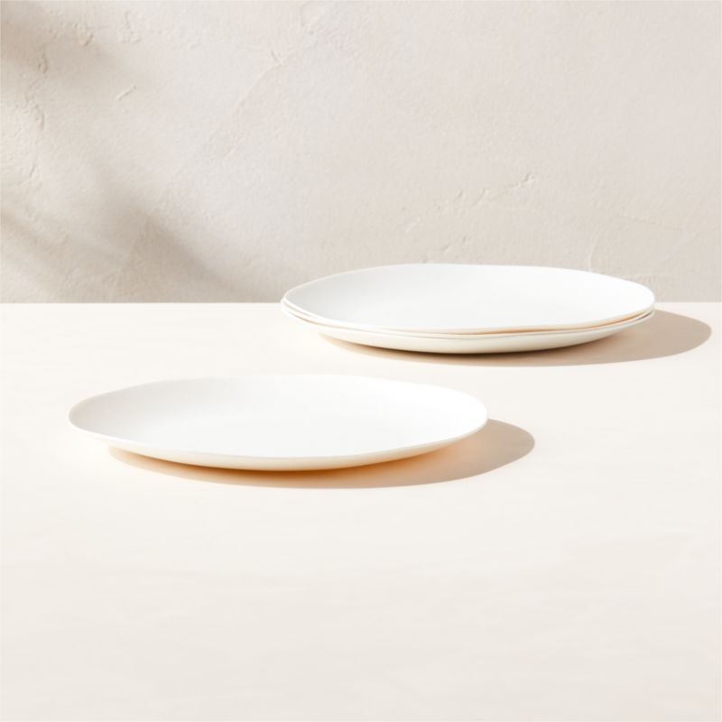 Soft matte white salad plates are modern in both form and materiality. Clean contours are crafted of a durable mix of melamine and bamboo powder. Natural bamboo powder gives the plates a subtle flecked finish. Pair the break-resistant salad plates with the coordinating Pebble dinnerware collection to set an alfresco table. CB2 exclusive.
