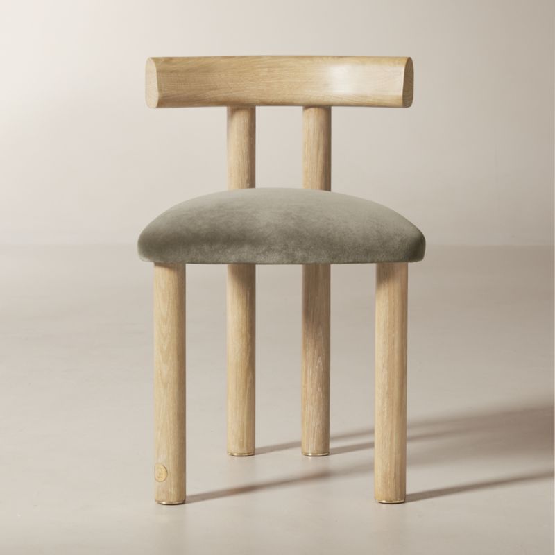goop is a sleek take on a classic silhouette with its deep, armless profile, vertical lines and contoured T-back. Plush performance velvet in French grey provides an elegant counterpoint to the warmth of lightly wirebrushed and cerused American white oak certified sustainable by the Forest Stewardship Council® (FSC), while a brass "g" medallion on the front leg lends a refined final flourish. The brass is unlacquered for a living finish that will develop the patina of a vintage find. CB2 exclusive.