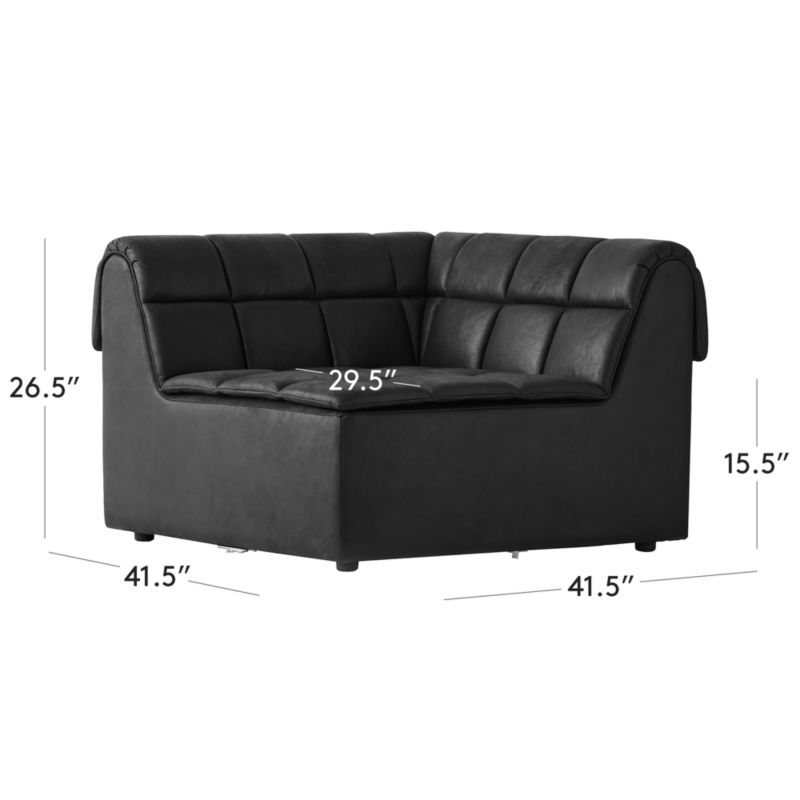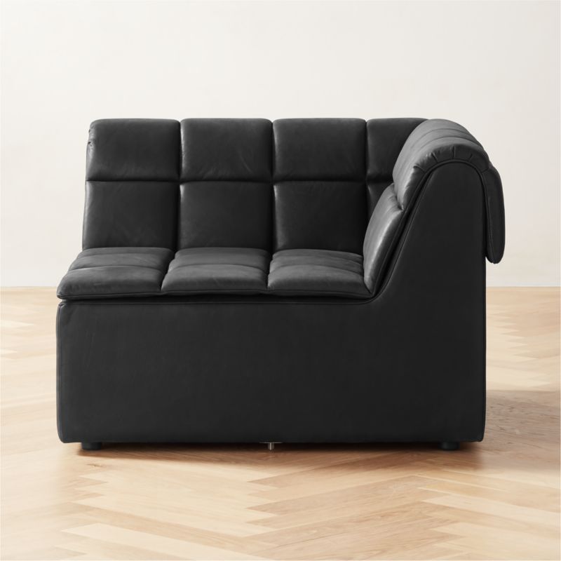 Mermelada Estudio, black leather corner chair has a low profile designed for lounging. Deep, wide '70s-influenced silhouette evokes the era of conversation pits, with clever construction details such as square tufting and slim cushions that attach to the frame. Wrapped in gorgeous black Moore & Giles leather and crafted with solid birch certified sustainable by the Forest Stewardship Council® (FSC), it's part of a modular sectional system that can be repositioned to suit a variety of seating needs. CB2 exclusive.