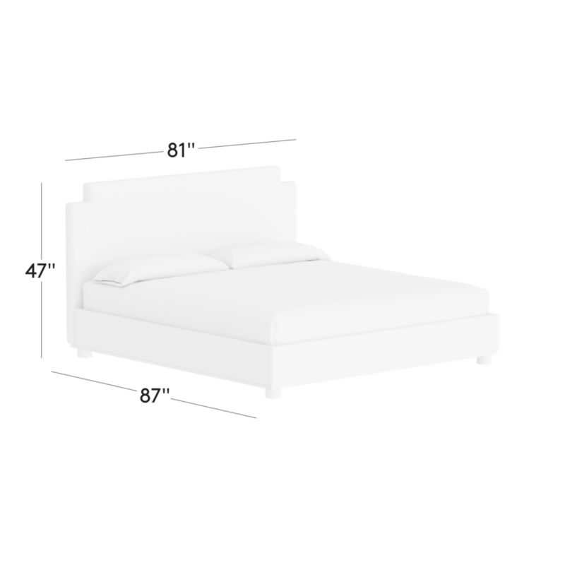 Classic bed design by Ross Cassidy features elegant headboard cutouts for a stately look. Headboard, footboard and siderails are fully upholstered in performance fabric that looks like crisp white linen while being designed for daily life. Plinth base and legs, crafted from red oak certified sustainable by the Forest Stewardship Council ®, complement the velvet with a light brown stain. CB2 exclusive.