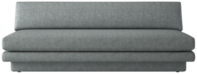 Tonal grey boucle sofa by Kara Mann has more than a touch of 1980s glamour. Wrapped in a soft boucle with subtle striation, the sofa is set atop an upholstered plinth for uninterrupted textural appeal. CB2 exclusive.