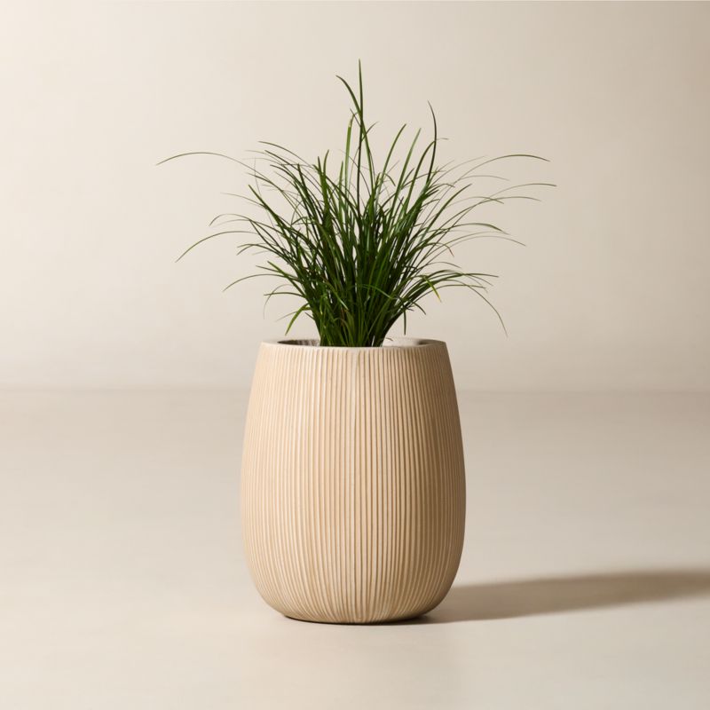 Substantial planter fools the eye. Composed of cement, sand and fiberglass, planter pot is surprisingly lightweight and super durable. Warm taupe finish makes it a natural fit for any outdoor space. CB2 exclusive.