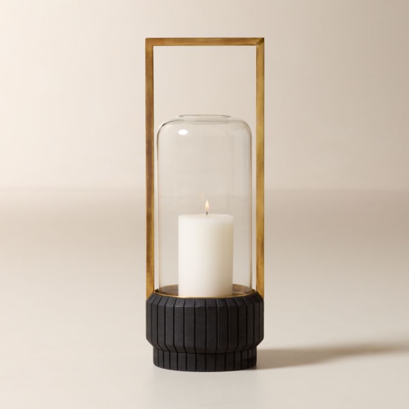 Outdoor lantern by Brett Beldock forms a study in contrast. A bold hand-welded brass handle in a dark bronze finish draws a strong architectural line, set deliberately against the softened curves of its hand-carved ebonized teak base. The look resolves in a delicate hand-blown glass hurricane that adds lightness to the weight of the materials. CB2 exclusive.