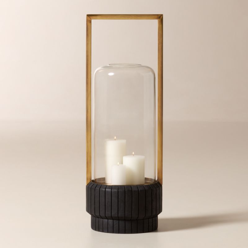 Outdoor lantern by Brett Beldock forms a study in contrast. A bold hand-welded brass handle in a dark bronze finish draws a strong architectural line, set deliberately against the softened curves of its hand-carved ebonized teak base. The look resolves in a delicate hand-blown glass hurricane that adds lightness to the weight of the materials. CB2 exclusive.