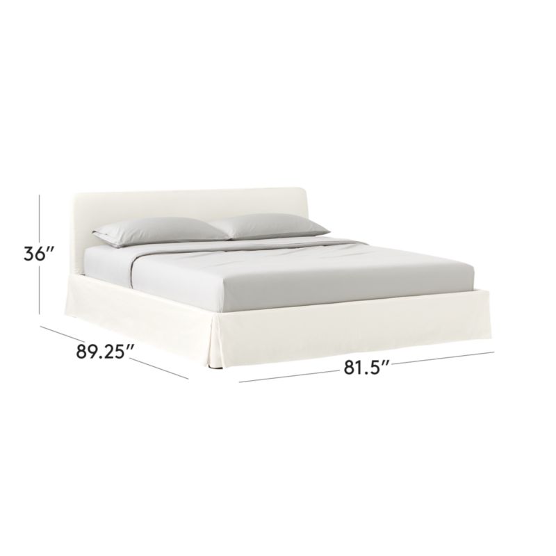 Beauty is in the details of this ivory king bed by Kara Mann. One slipcover fits over the entire frame, draping it in luxe sateen. Perfectly tailored box pleats line the corners. "Even when something is simple, it's those little details that can make it feel so special," explains Kara. CB2 exclusive.