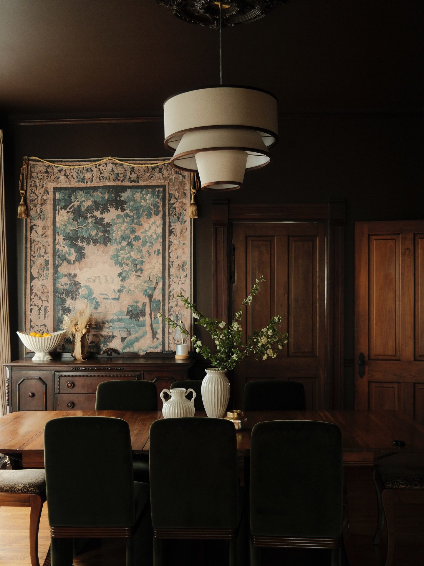 European white birch and engineered wood frame this fully upholstered dining chair by Brett Beldock. High back creates an air of sophistication while dark green velvet adds warmth and luxury. Rich wood channeling wraps around the seat in a tone that reads from light to dark, depending on the way the sunlight hits. Learn more about