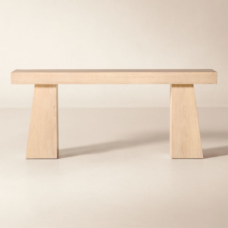 Praised for her crisp yet off-beat approach, fashion-turned-home-designer Brett Beldock created a one-of-a-kind console table rendered in bleached oak. With bold, flared legs and an expansive top, the table is wirebrushed to play up the wood's texture and natural grain. CB2 exclusive.