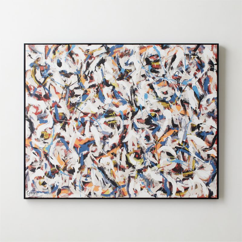 Michael Cross is an artist based in Mesquite, Texas, where he works in an abstract painting style filled with forms and movement. His open style encourages each viewer to experience his paintings personally. Here, the rich surface of "Rio" draws you in, evoking a quiet energy. This initial impression slowly reveals a collection of what Cross calls "events" happening across the canvas surface. Varied brushstrokes become pathways to follow into the layers of paint. Presented in a clean, modern black frame. CB2 exclusive.