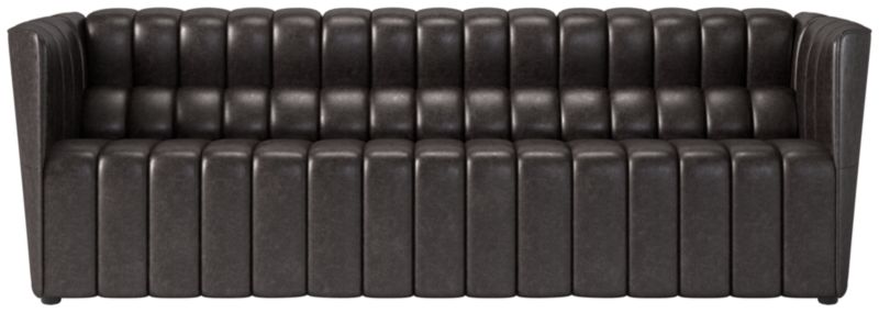 Out of production for decades, the classic Steen Østergaard leather sofa from 1980 has been reissued exclusively for CB2. With neat topstitching details and a welt trim, the sofa is upholstered in a polished full-grain leather that has the velvety feel of a vintage bomber jacket. The look leans modern, softened by plush cushions and tailored channel tufting. CB2 exclusive.