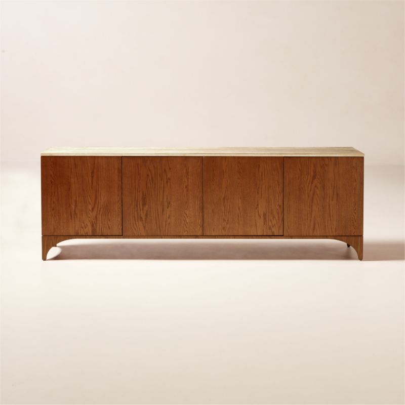 Minimalist white oak media console by Barcelona-based Mermelada Estudio is designed to give full expression to the wood. The streamlined silhouette reveals a juxtaposition of crisp corners and rounded legs that finish in an arc at each end. Topped with a slab of honed travertine for a raw finish with visible unfilled pitting. CB2 exclusive.